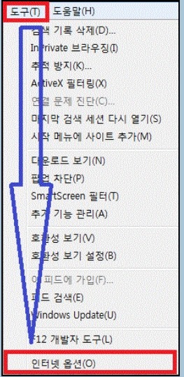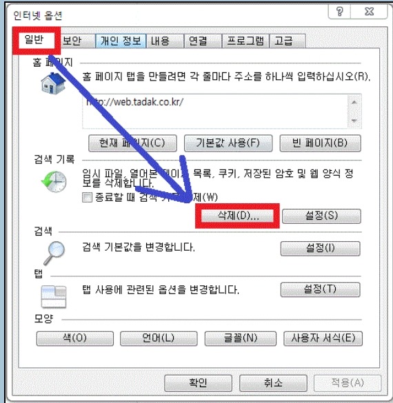 1. 익스플로러실행 - 도구(T) - 인터넷 옵션(O) - 일반