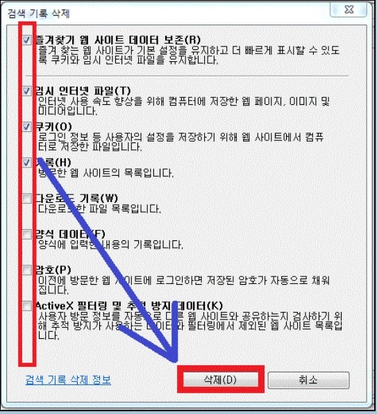 검색 기록 삭제 창이 뜨면 원하는 부분에 체크하고 삭제를 눌러주시는것이