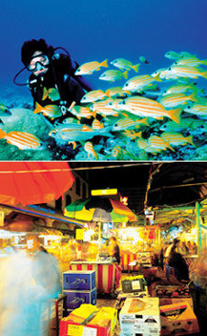 해양스포츠를 즐기는 관광객(사진 위), 야시장.