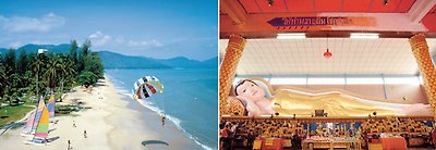 페낭의 해변(왼쪽), 누워 있는 석가사원.