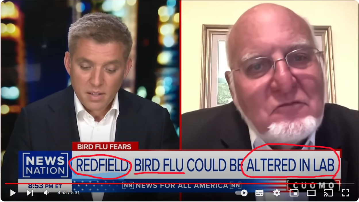 “Dr. Redfield는 향후 조류 독감 팬데믹이 코로나19보다 더 심각해질 것으로 전망하면서 잠재적인 치사율이 50%에 달하는 등 전 세계에 파괴적인 영향을 주게 될 것이라고 경고했다. 그는 정부가 2012년부터 실험실용 조류 독감을 연구해 왔다는 것을 사실상 인정했다. 그는 이론적으로 ‘기능획득 연구를 통해 말 그대로 몇 주에서 몇 달 안에 바이러스를 바꿀 수 있다’고 말했다.”