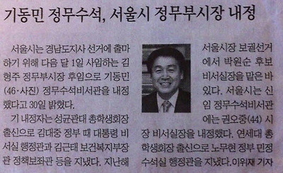*좌파 서울시장의 정무부시장 후임 人事(인사)를 사진과 함께 가로 2단 기사로 친절하게 실었다.