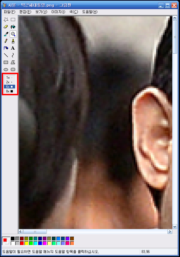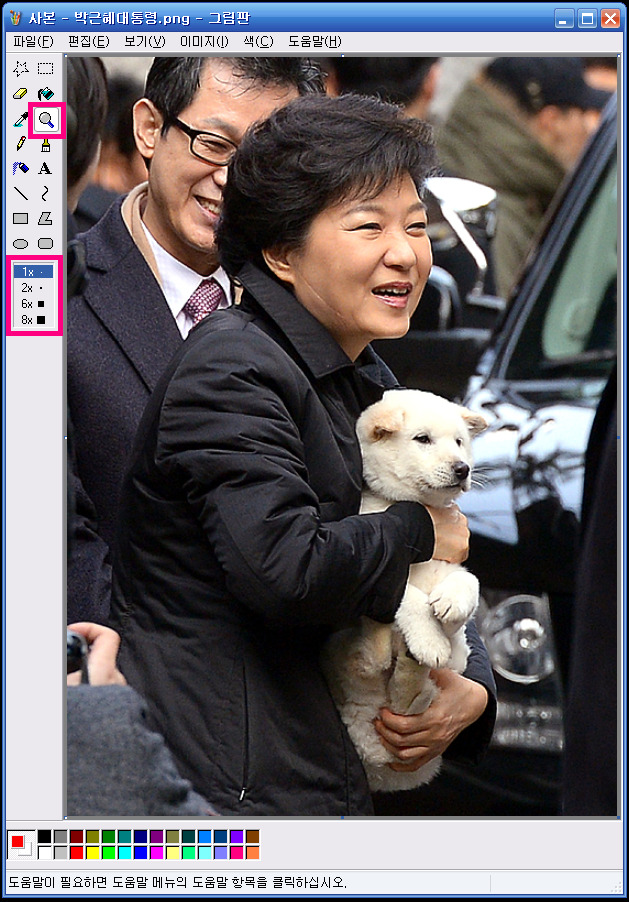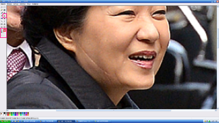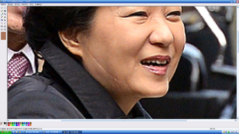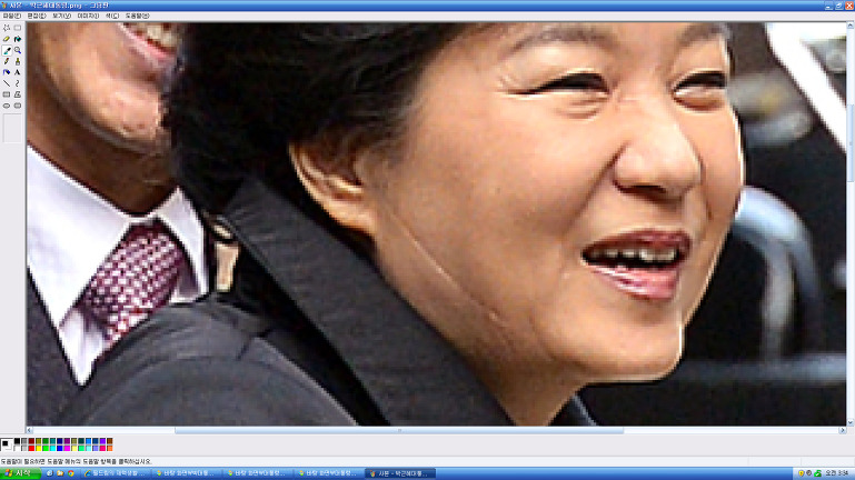 윈도우 그림판에 도트작업을 하여 박대통령님의 얼굴 흉터를 제거한 모습입니다.흉터가 안보이죠?