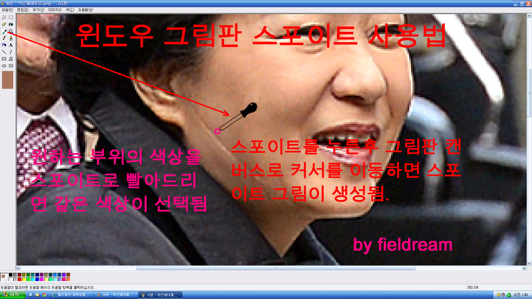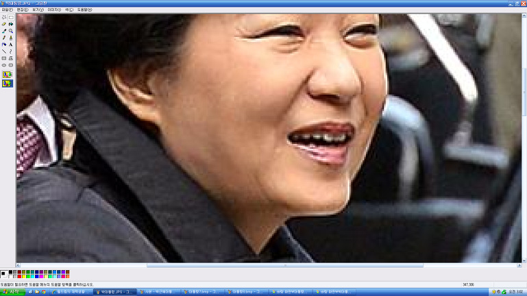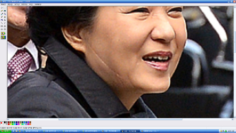 오늘은 제가 성형외과 의사는 아니지만 수집된 사진의 박근혜 대통령님의 얼굴 흉터를 나름 정성을 다하여 제거해 보았습니다.물론 더듬거리는 컴퓨터 실력으로 윈도우(XP)의 그림판을 이용한 도트(Dot)작업이라 포토샵(Photo Shop)보다는 완성도가 높지 않겠지만 그 과정을 소개해 드립니다.