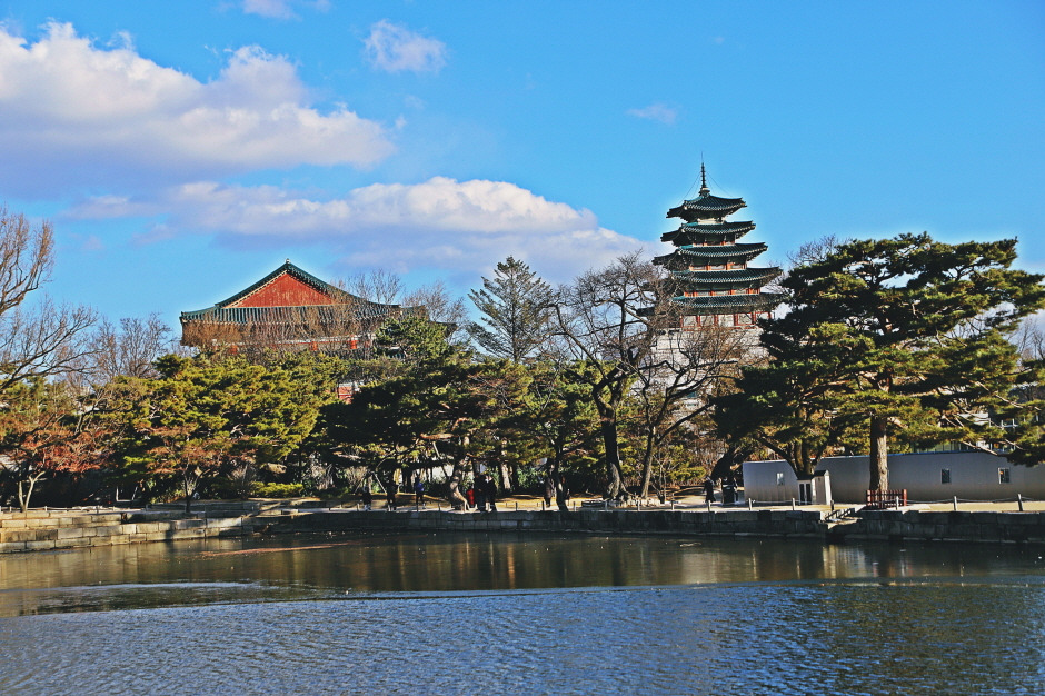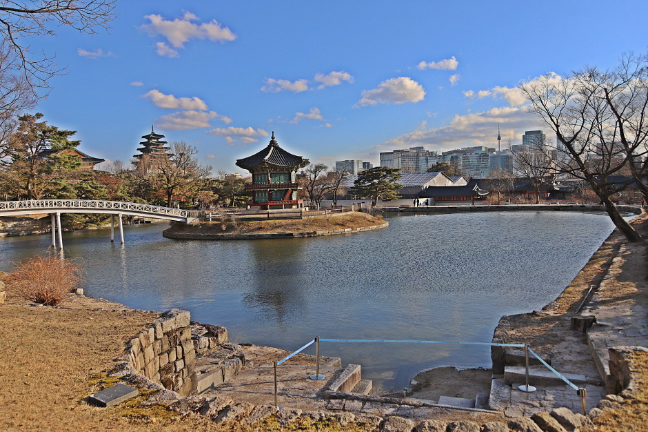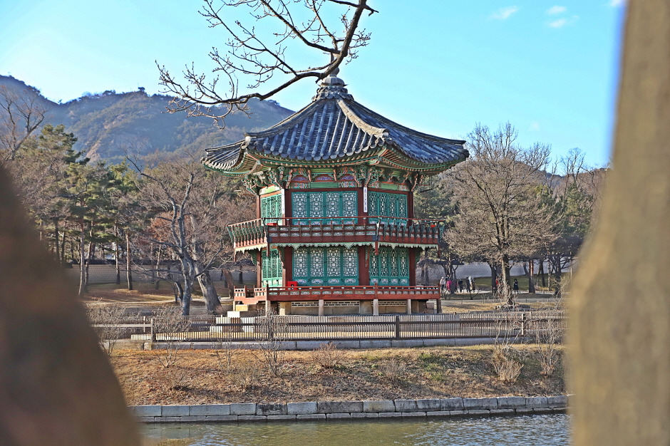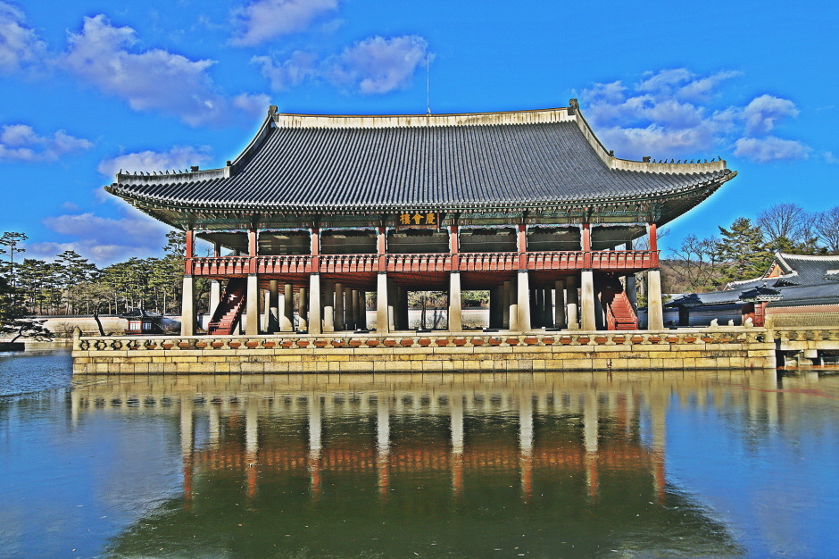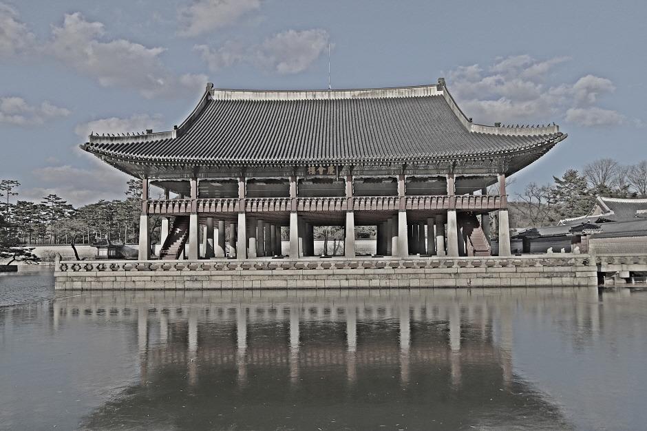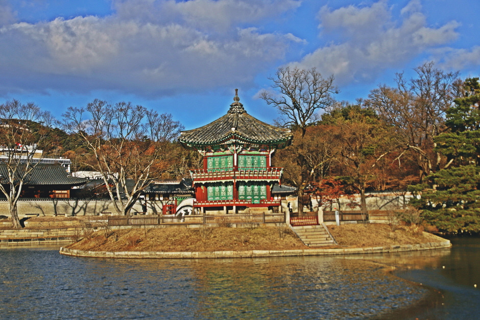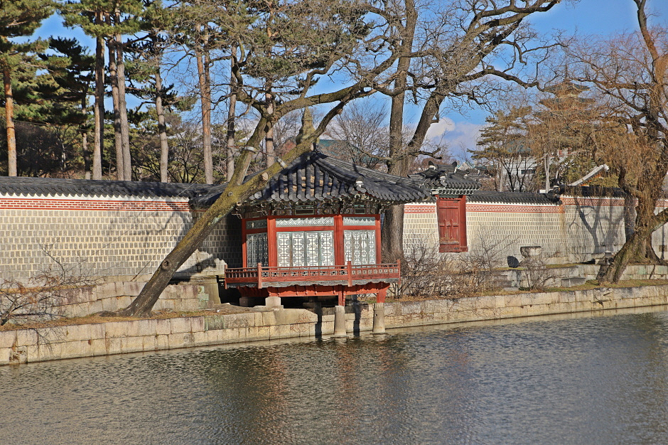 건물. 근정전 서북쪽에 있는 방형 연못 안에 세운