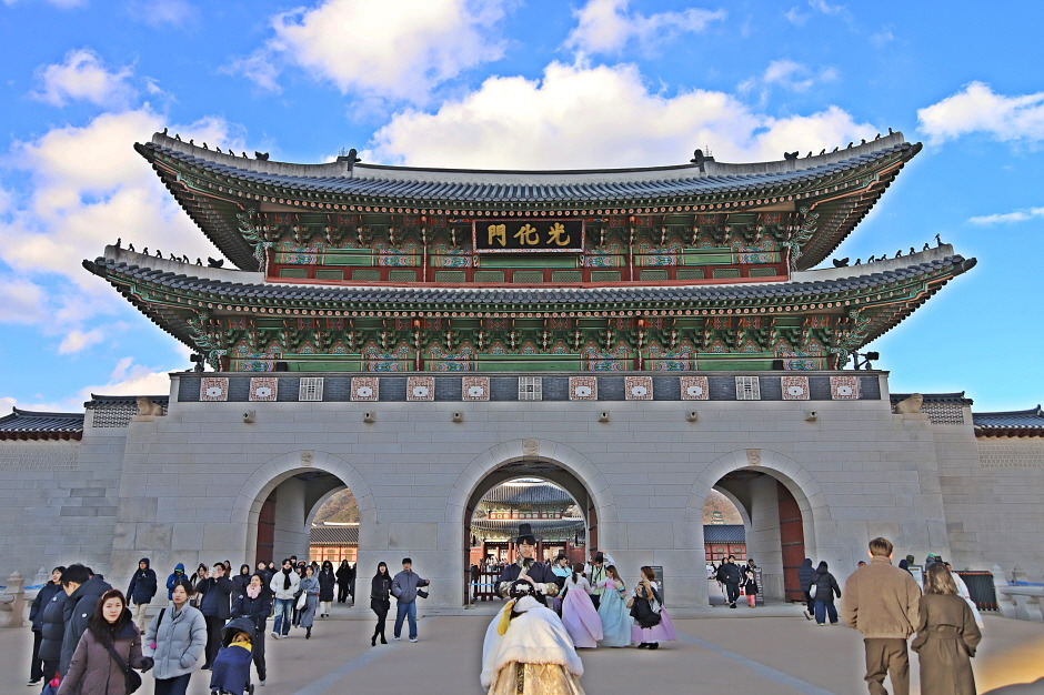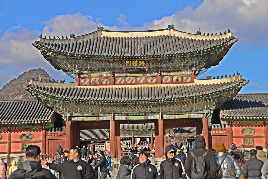 앞면 3칸, 옆면 2칸의 2층 문루인 근정문의 좌우에 일화문