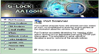 철수는 자신의 PC에 열려있을 수 있는 포트에 대한 검색과 친구 광석이가 이번에 설치한 Windows advancd server 2000의 취약점을 G-Lock AATools를 이용해 찾고자 한다. Advanced Administrative Tools란 이름으로 메뉴에서 실행되는데 포트스캐너, 프락시분석기(서버와 클라이언트 사이에서 속도증진을 위한 중재작업을 해주는 역할), CGI분석기, 전자메일 검증기, 상대방 추적, 네트워크 상태, 링크 분석시, 시스템 정보, 진행정보 등의 기능을 제공한다. 30일 제한된 버전을 무료로 사용할 수 있으며 초기화면은 다음과 같다.
