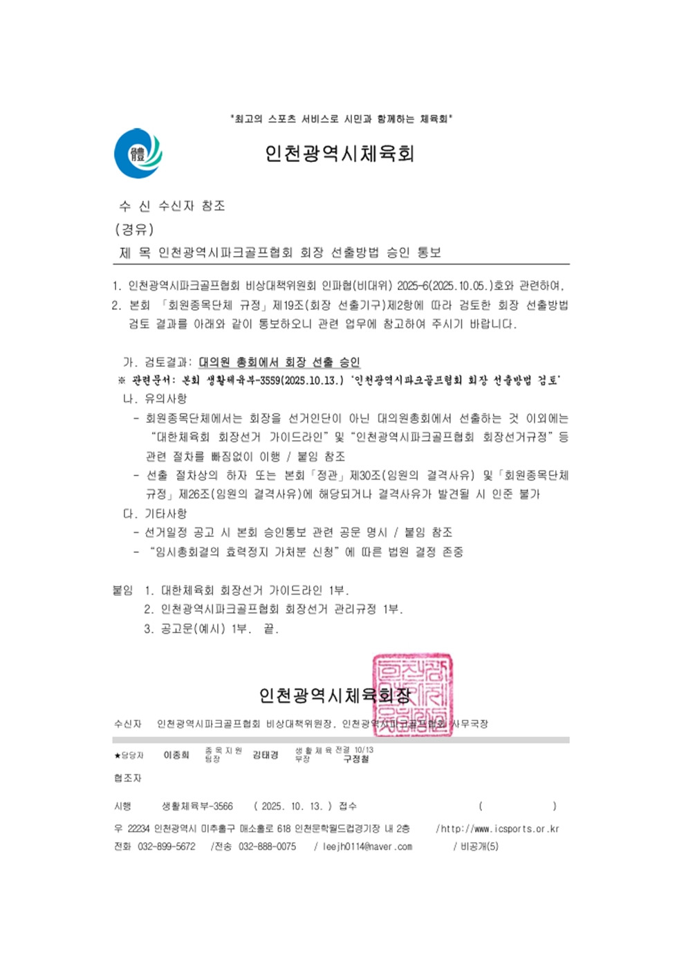 인천시파크골프협회 제4대 회장선거 시체육회 승인통보 공문 작성자정천수 선거운영위원장|작성시간25.10.13|조회수352 목록 댓글 0 글자크기 작게가 글자크기 크게가 인천시파크골프협회 회장선출방법승인통보001.jpg272.29KB 첨부파일첨부된 파일이 2개 있습니다. jpg 파일 인천시파크골프협회 회장선출방법승인통보001.jpg 다운로드 jpg 파일 인천시파크골프협회 회장선출방법승인통보001.jpg 다운로드 다음검색 현재 게시글 추가 기능 열기 북마크 공유하기 신고 센터로 신고 댓글 댓글 0 댓글쓰기 답글쓰기 댓글 리스트