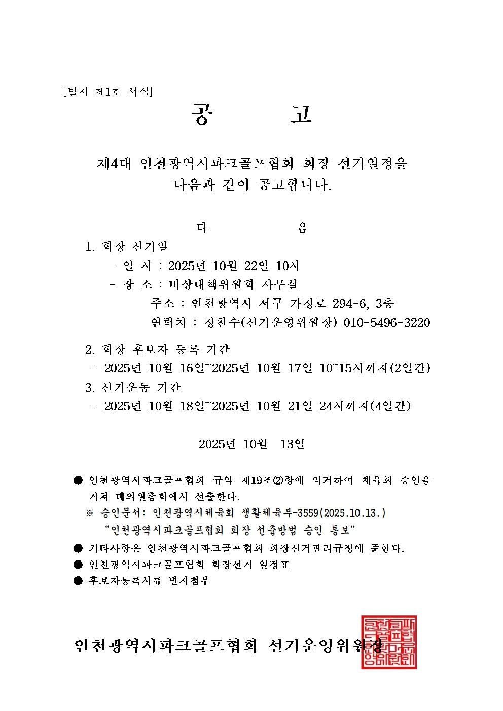 공고문(인천광역시파크골프협회 제4대회장선거) 작성자정천수 선거운영위원장|작성시간25.10.14|조회수528 목록 댓글 0 글자크기 작게가 글자크기 크게가 후보자 등록 서류 일체 (1).hwp1.03MB제26조임원의 결격사유.hwp65.00KB인천시파크골프협회 제4대 회장 선거 일정표.hwp1.04MB 첨부파일첨부된 파일이 4개 있습니다. jpg 파일 공고문2025.10.13. (1)001.jpg 다운로드 hwp 파일 인천시파크골프협회 제4대 회장 선거 일정표.hwp 다운로드 hwp 파일 제26조임원의 결격사유.hwp 다운로드 hwp 파일 후보자 등록 서류 일체 (1).hwp 다운로드 다음검색 현재 게시글 추가 기능 열기 북마크 공유하기 신고 센터로 신고 댓글 댓글 0 댓글쓰기 답글쓰기 댓글 리스트