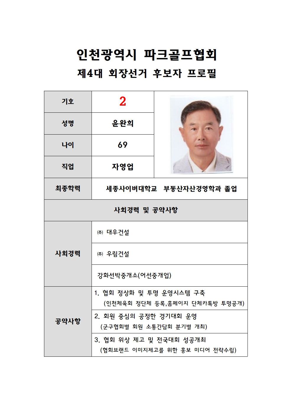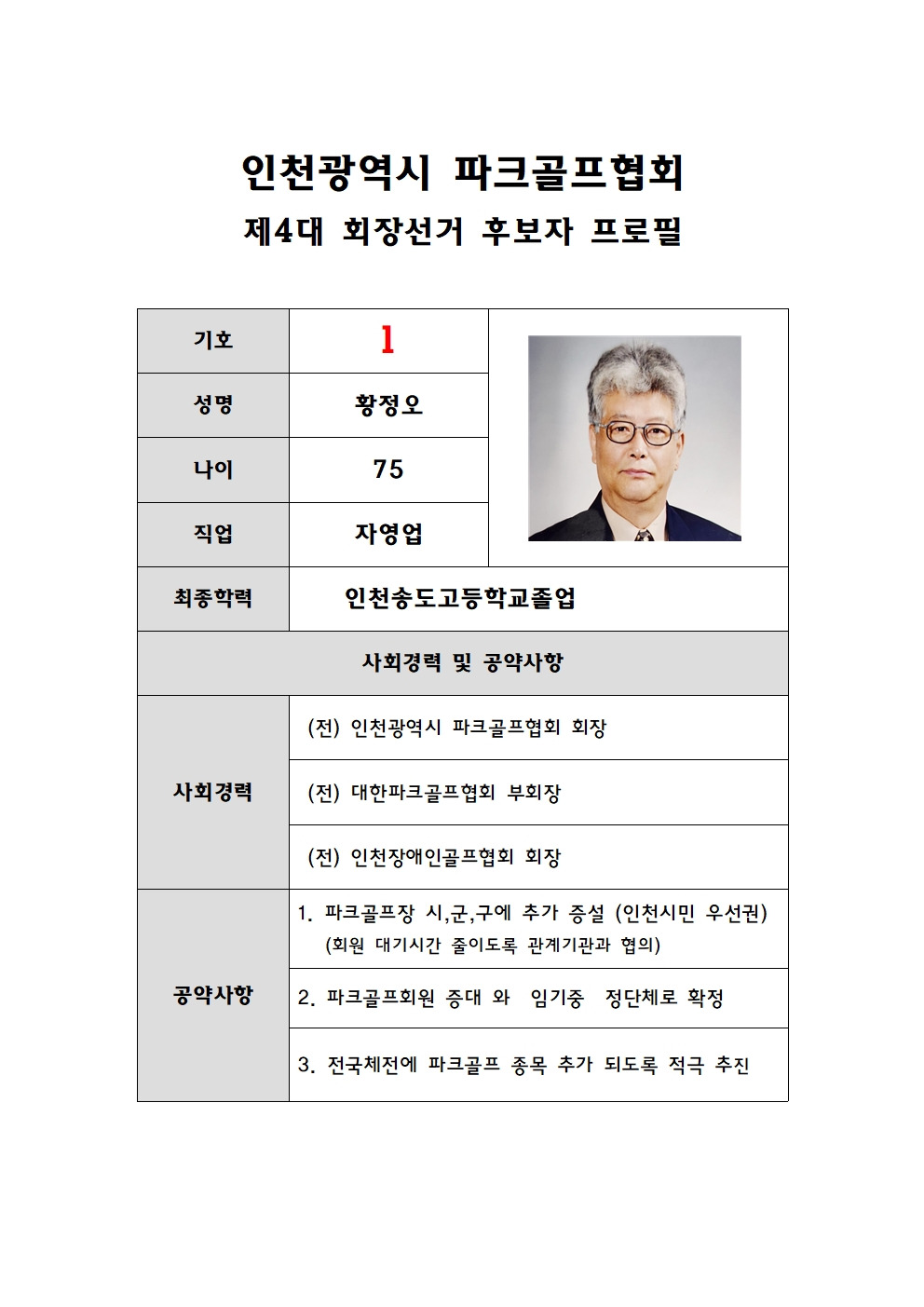 인천광역시 파크골프협회 제4대 회장 보궐 선거 입후보자 프로필입니다