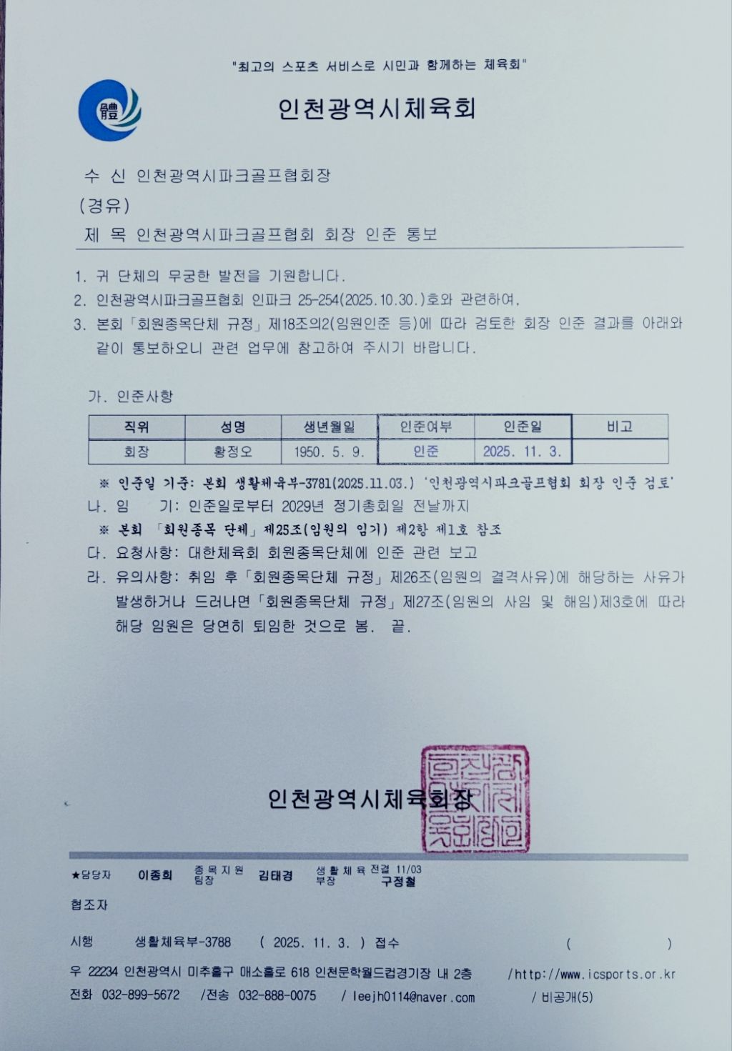 인천광역시파크골프협회 회장 인천체육회 인준 통보 작성자한인순 01052785494|작성시간25.11.04|조회수428 목록 댓글 2 글자크기 작게가 글자크기 크게가 다음검색 현재 게시글 추가 기능 열기 북마크 공유하기 신고 센터로 신고 댓글 댓글 2 댓글쓰기 답글쓰기 댓글 리스트 작성자김구 영 | 작성시간 25.11.04 협회장 인준을 축하드립니다.♡♡ 작성자허지용 | 작성시간 25.11.08 축하드립니다 댓글 전체보기
