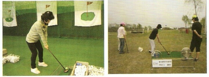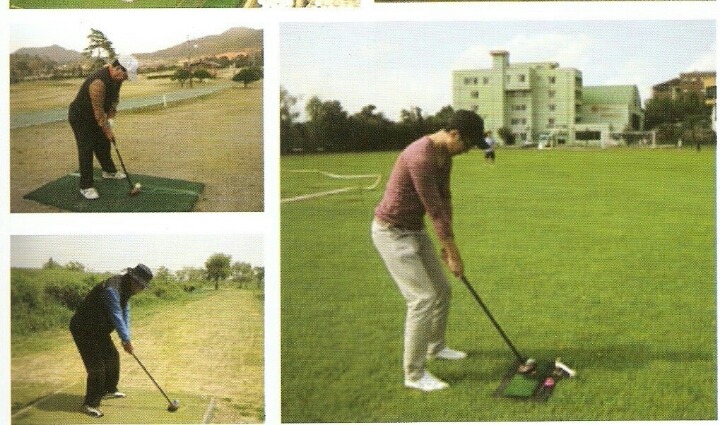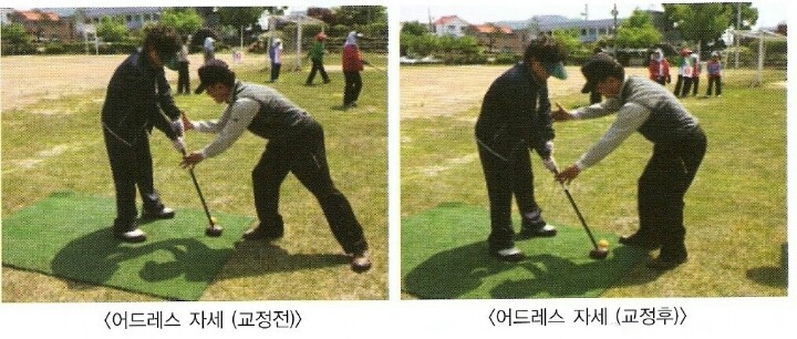 ④ 공에 위치한 클럽 헤드가 클럽 헤드면 중앙에 공이 위치하지 않았을시는 양발 끝을 평행 이동시켜 정확한 위치로 수정한다.