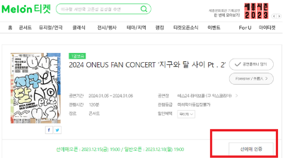 1. 멜론 티켓 로그인 > [2024 박강현 팬미팅 ‘IN:JOYDAY’] 상세페이지 클릭 > [선예매 인증] 클릭