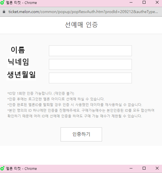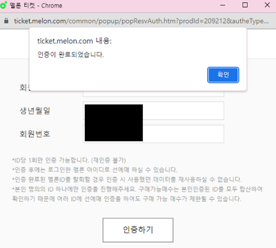 - 선예매 신청시 제출하신 정보와 선예매 인증시 입력한 정보가 조금이라도 다를 경우 인증되지 않으며, 소속사와 예매처가 도와드릴 수 있는 방법이 없습니다. 반드시 제출하신 정보(데이터)를 잘 기억하고 있으셨다가 인증 시에 동일하게 입력하여 주시길 부탁드립니다.