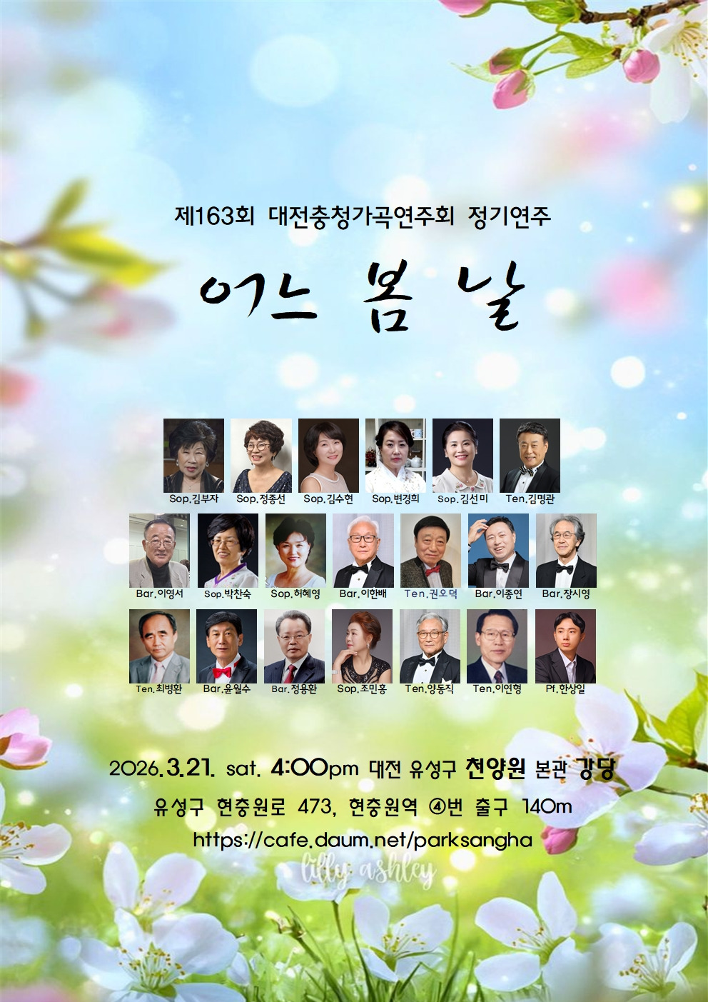 제163회 대전충청가곡연주회 정기연주 26.3.21.토.천양원강당. 작성자김명관|작성시간26.03.10|조회수32 목록 댓글 0 글자크기 작게가 글자크기 크게가 다음검색 현재 게시글 추가 기능 열기 북마크 공유하기 신고 센터로 신고 댓글 댓글 0 댓글쓰기 답글쓰기 댓글 리스트