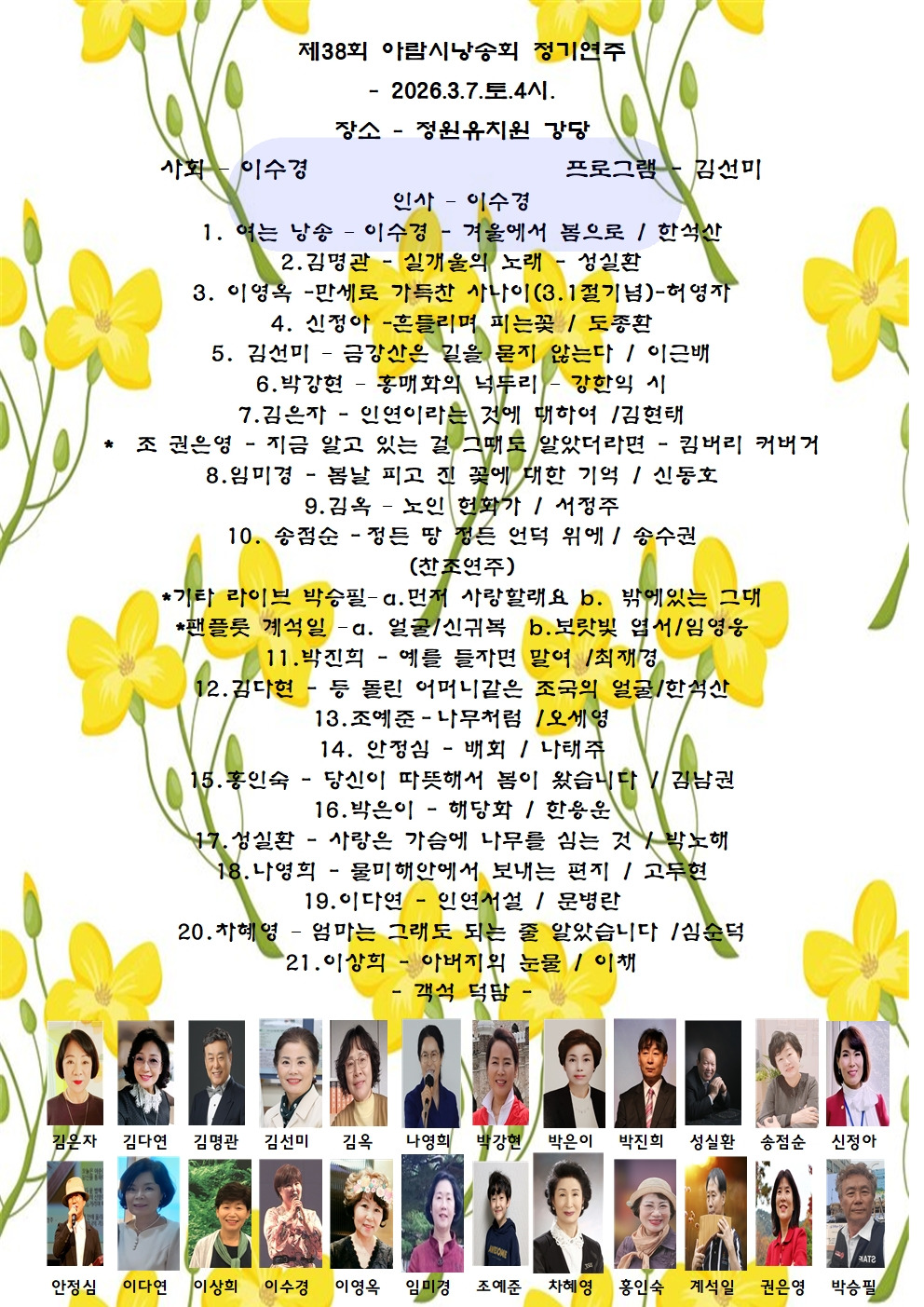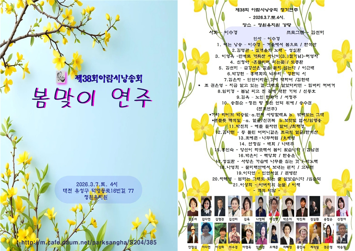 [스크랩] 제38회 아람시낭송회 정기연주 - 2026.3.7.토.4시 - 정원유치원강당 작성자김명관|작성시간26.03.07|조회수66 목록 댓글 0 글자크기 작게가 글자크기 크게가 다음검색 스크랩 원문 : 박상하의 음악살롱 현재 게시글 추가 기능 열기 북마크 공유하기 신고 센터로 신고 댓글 댓글 0 댓글쓰기 답글쓰기 댓글 리스트