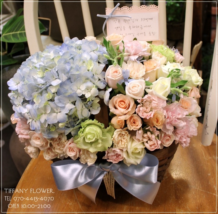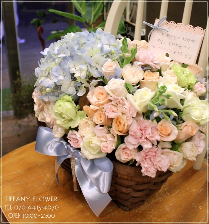 축하꽃바구니로 가장 인기가 많은 예쁜수국꽃바구니로 일산MBC근처 예쁜꽃집 티파니플라워에서 추천드립니다.