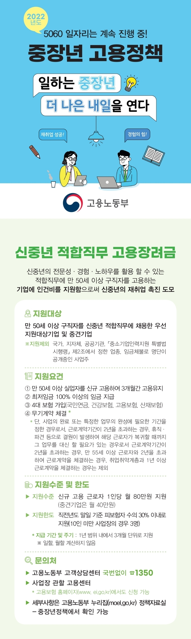신중년의 전문성·경험·노하우를 활용할 수 있는 적합 직무에 만 50세 이상 구직자를 고용하는 기업에 인건비를 지원함으로써 신중년의 재취업 촉진 도모