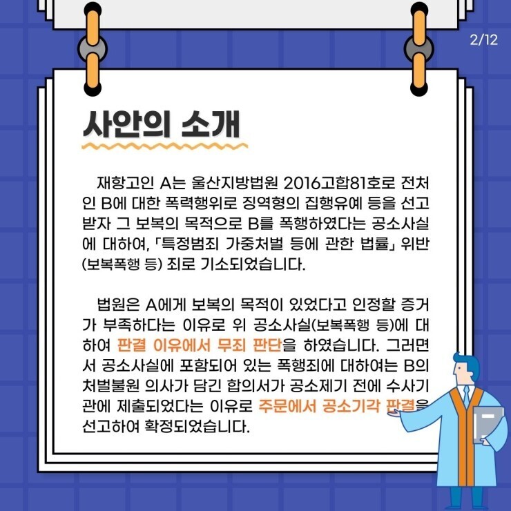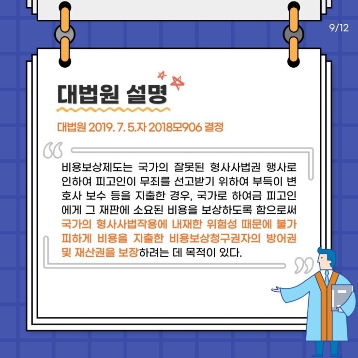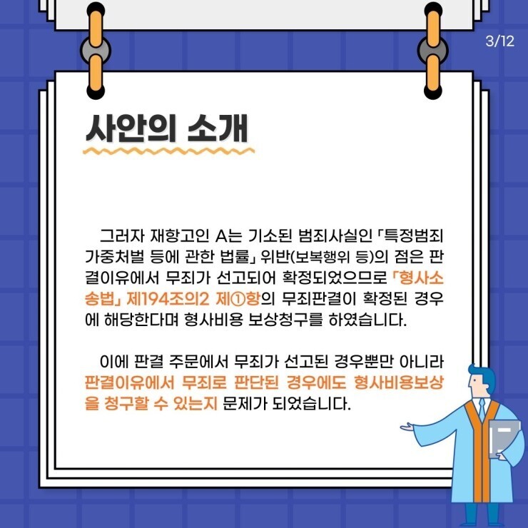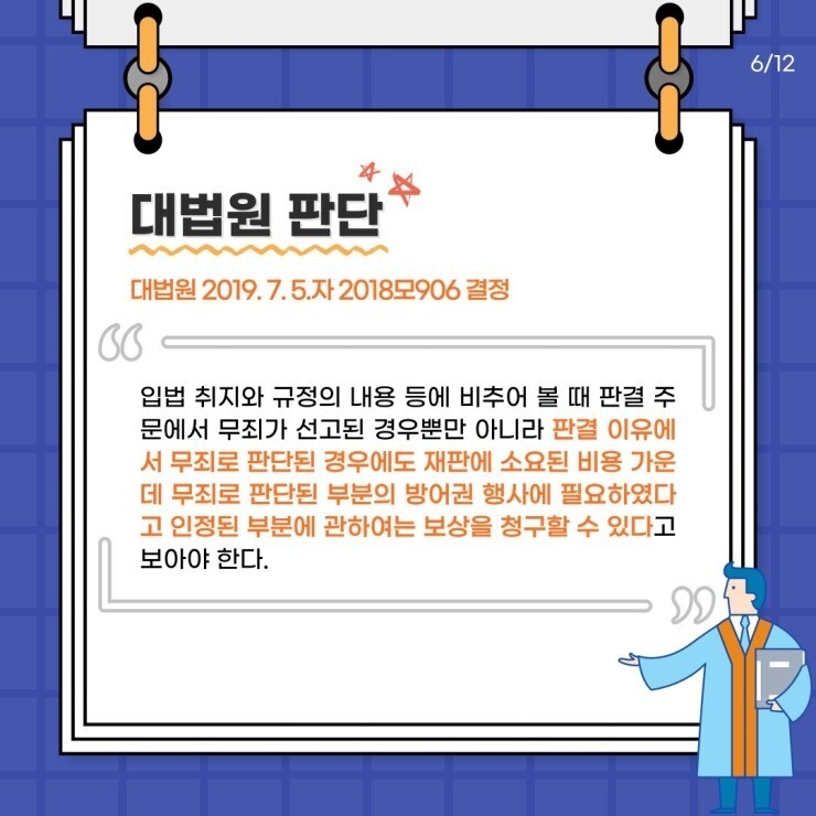 이번 시간에는 형사(비용)보상 제도에 대해 알아보고 판결주문 외 판결이유에서 무죄로 판단될 경우 비용보상 제도를 활용할 수 있는지에 살펴보겠습니다.