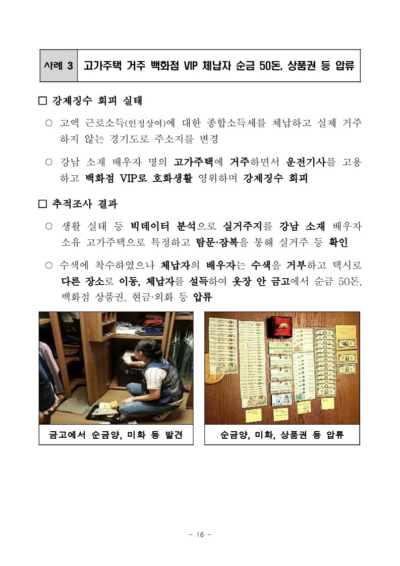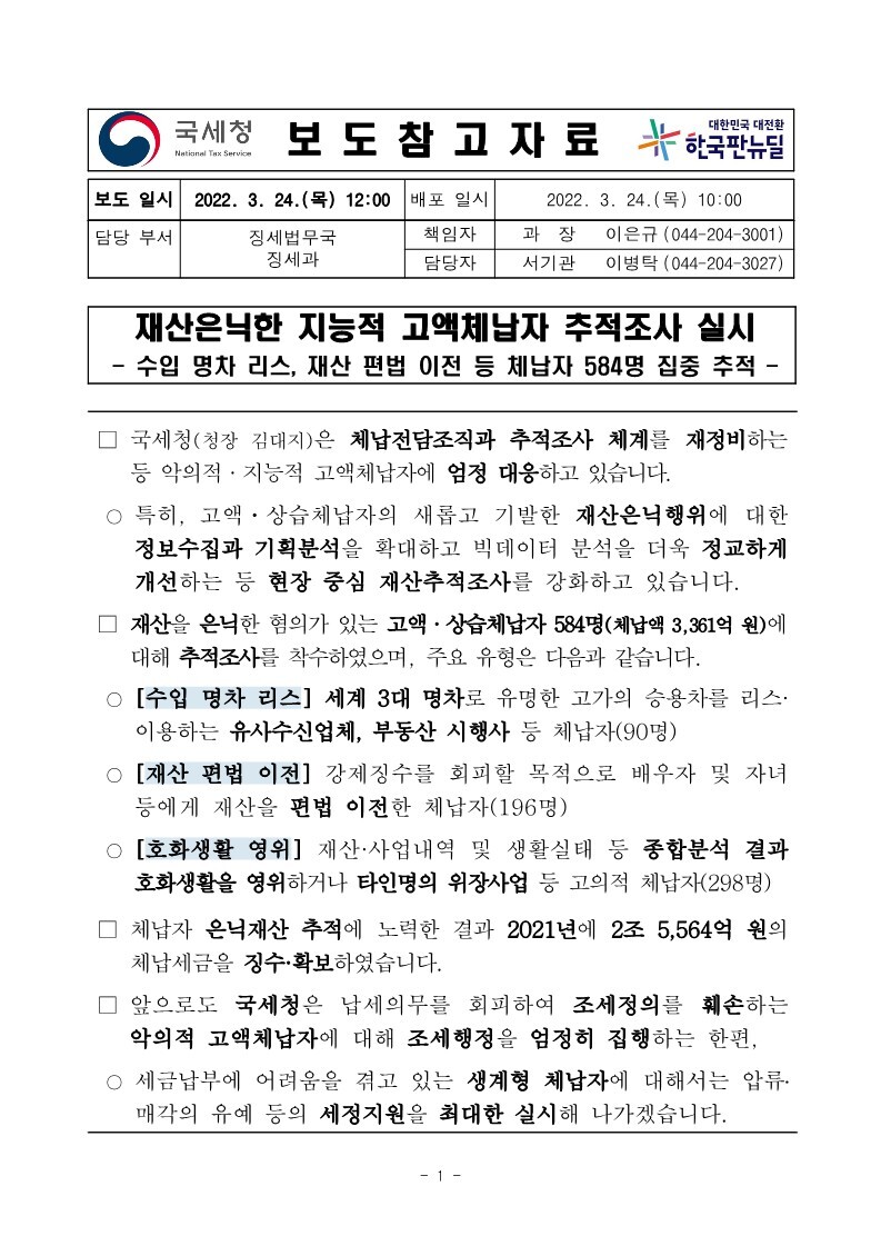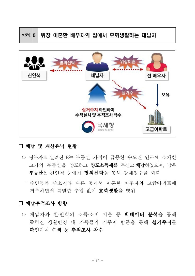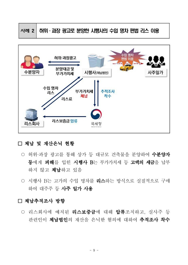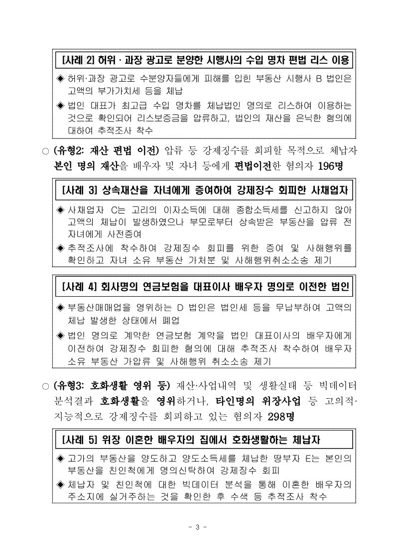 재산은닉한 지능적 고액체납자 추적조사 실시 작성자로우인|작성시간22.03.30|조회수13 목록 댓글 0 글자크기 작게가 글자크기 크게가 220324 체납추적조사 보도참고자료(홈페이지 게시용) .pdf1.33MB출처 : 국세청링크 : https://www.nts.go.kr/nts/na/ntt/selectNttInfo.do?mi=2201&bbsId=1028&nttSn=1303749 첨부파일첨부된 파일이 17개 있습니다. jpg 파일 220324 체납추적조사 보도참고자료(홈페이지 게시용) _1.jpg 다운로드 jpg 파일 220324 체납추적조사 보도참고자료(홈페이지 게시용) _7.jpg 다운로드 jpg 파일 220324 체납추적조사 보도참고자료(홈페이지 게시용) _2.jpg 다운로드 jpg 파일 220324 체납추적조사 보도참고자료(홈페이지 게시용) _6.jpg 다운로드 jpg 파일 220324 체납추적조사 보도참고자료(홈페이지 게시용) _8.jpg 다운로드 jpg 파일 220324 체납추적조사 보도참고자료(홈페이지 게시용) _9.jpg 다운로드 jpg 파일 220324 체납추적조사 보도참고자료(홈페이지 게시용) _3.jpg 다운로드 jpg 파일 220324 체납추적조사 보도참고자료(홈페이지 게시용) _5.jpg 다운로드 jpg 파일 220324 체납추적조사 보도참고자료(홈페이지 게시용) _10.jpg 다운로드 jpg 파일 220324 체납추적조사 보도참고자료(홈페이지 게시용) _4.jpg 다운로드 jpg 파일 220324 체납추적조사 보도참고자료(홈페이지 게시용) _11.jpg 다운로드 jpg 파일 220324 체납추적조사 보도참고자료(홈페이지 게시용) _12.jpg 다운로드 jpg 파일 220324 체납추적조사 보도참고자료(홈페이지 게시용) _15.jpg 다운로드 jpg 파일 220324 체납추적조사 보도참고자료(홈페이지 게시용) _13.jpg 다운로드 jpg 파일 220324 체납추적조사 보도참고자료(홈페이지 게시용) _16.jpg 다운로드 jpg 파일 220324 체납추적조사 보도참고자료(홈페이지 게시용) _14.jpg 다운로드 pdf 파일 220324 체납추적조사 보도참고자료(홈페이지 게시용) .pdf 다운로드 다음검색 현재 게시글 추가 기능 열기 북마크 공유하기 신고 센터로 신고 댓글 댓글 0 댓글쓰기 답글쓰기 댓글 리스트