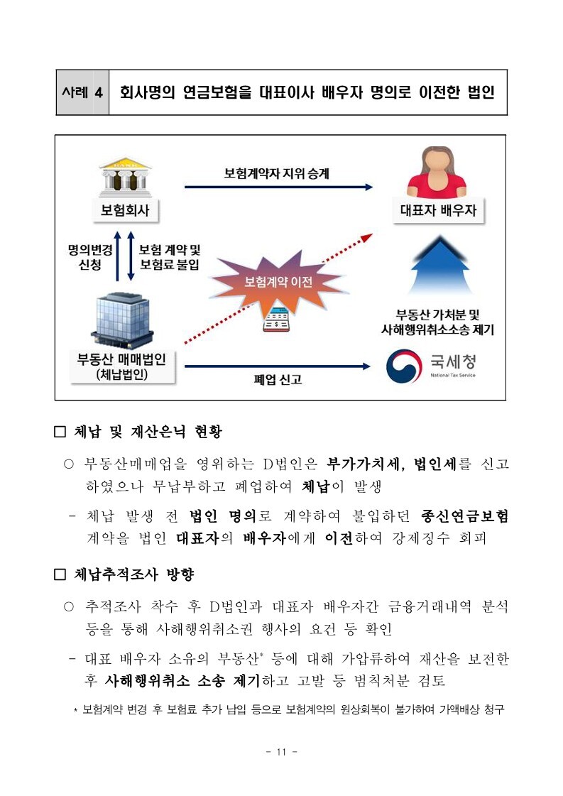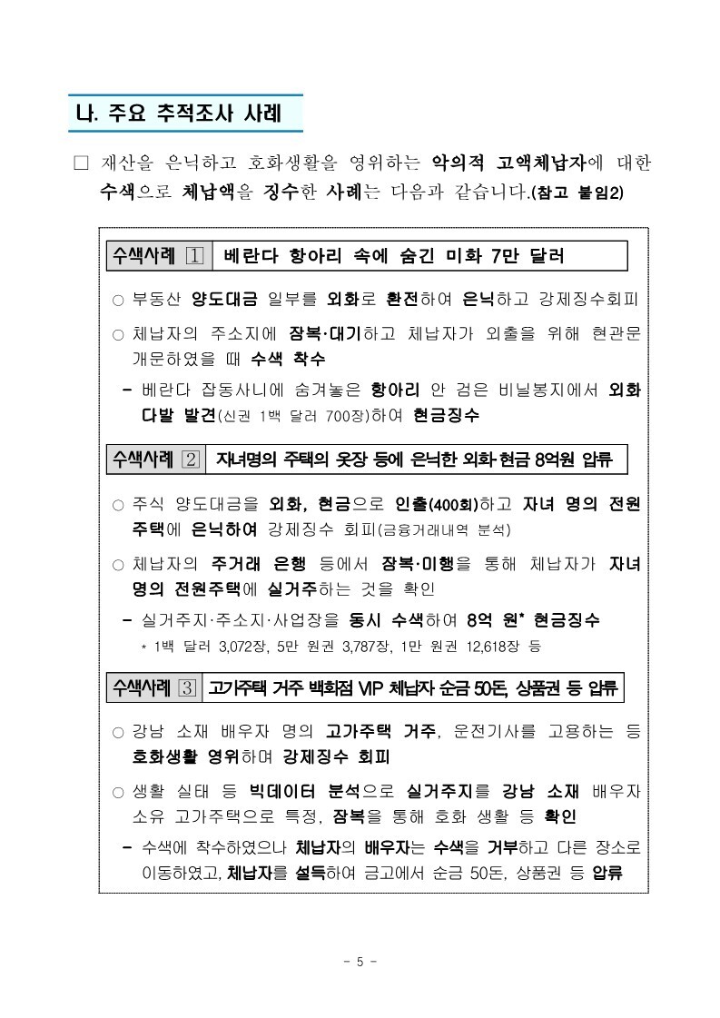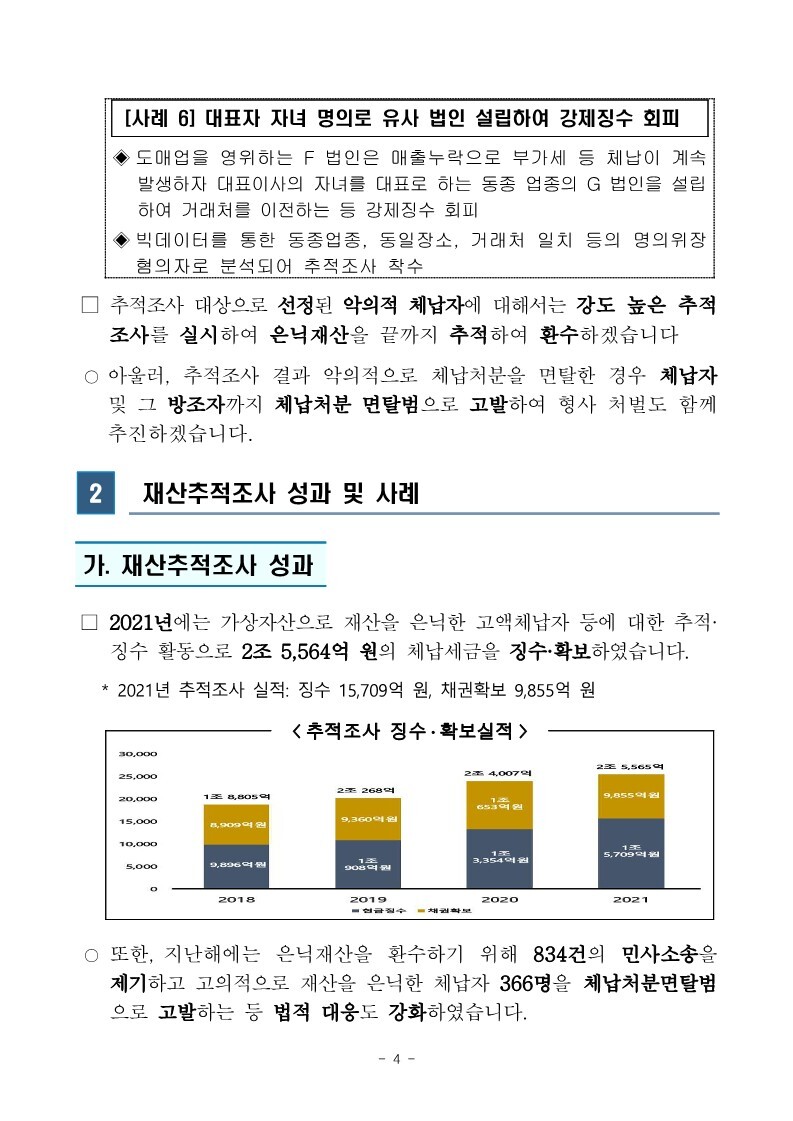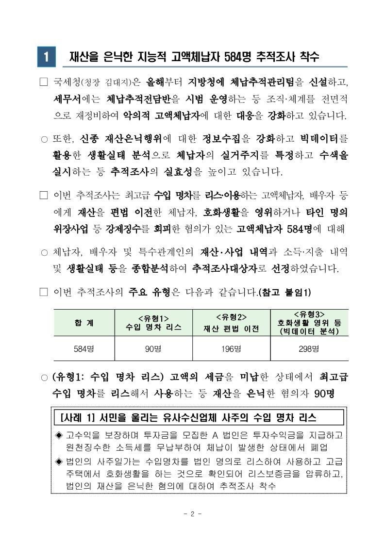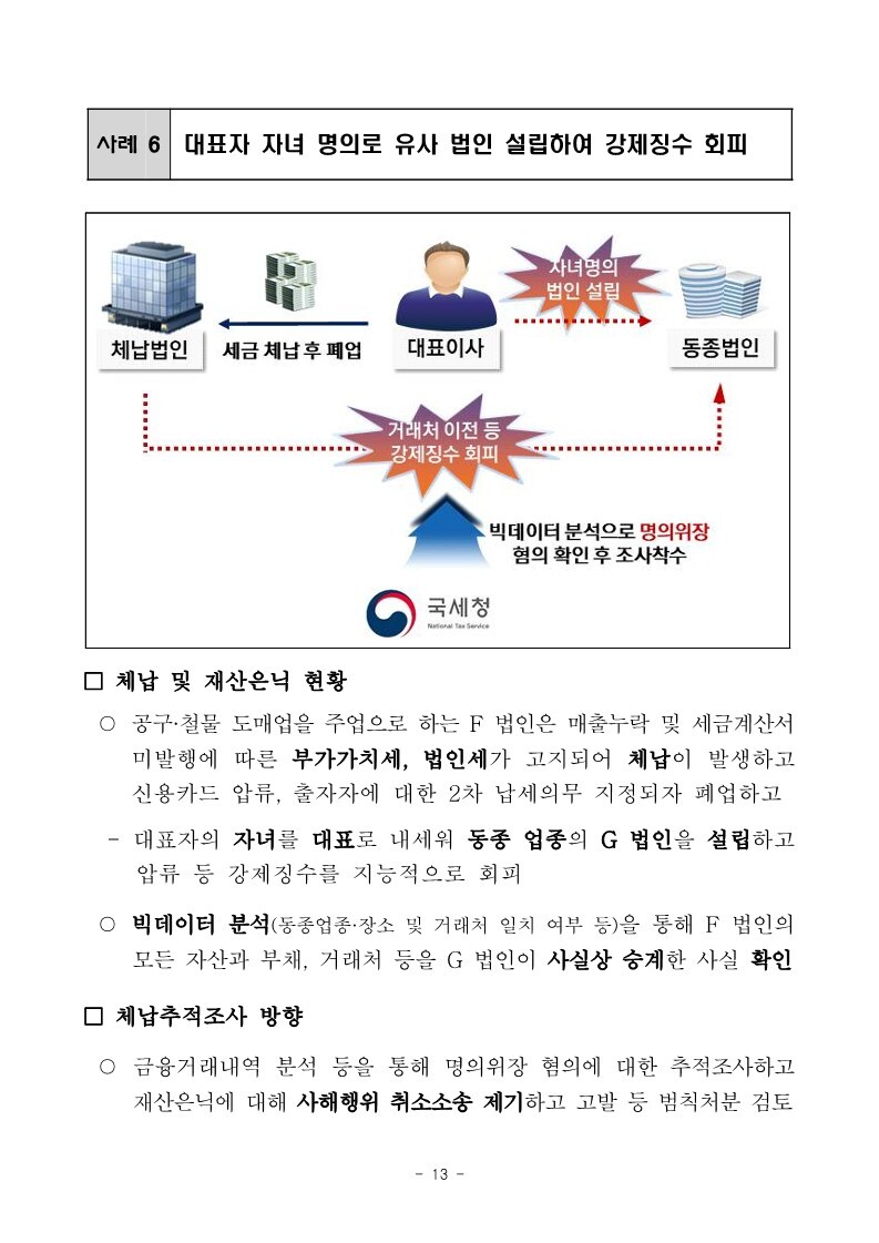 재산은닉한 지능적 고액체납자 추적조사 실시 작성자로우인|작성시간22.03.30|조회수13 목록 댓글 0 글자크기 작게가 글자크기 크게가 220324 체납추적조사 보도참고자료(홈페이지 게시용) .pdf1.33MB출처 : 국세청링크 : https://www.nts.go.kr/nts/na/ntt/selectNttInfo.do?mi=2201&bbsId=1028&nttSn=1303749 첨부파일첨부된 파일이 17개 있습니다. jpg 파일 220324 체납추적조사 보도참고자료(홈페이지 게시용) _1.jpg 다운로드 jpg 파일 220324 체납추적조사 보도참고자료(홈페이지 게시용) _7.jpg 다운로드 jpg 파일 220324 체납추적조사 보도참고자료(홈페이지 게시용) _2.jpg 다운로드 jpg 파일 220324 체납추적조사 보도참고자료(홈페이지 게시용) _6.jpg 다운로드 jpg 파일 220324 체납추적조사 보도참고자료(홈페이지 게시용) _8.jpg 다운로드 jpg 파일 220324 체납추적조사 보도참고자료(홈페이지 게시용) _9.jpg 다운로드 jpg 파일 220324 체납추적조사 보도참고자료(홈페이지 게시용) _3.jpg 다운로드 jpg 파일 220324 체납추적조사 보도참고자료(홈페이지 게시용) _5.jpg 다운로드 jpg 파일 220324 체납추적조사 보도참고자료(홈페이지 게시용) _10.jpg 다운로드 jpg 파일 220324 체납추적조사 보도참고자료(홈페이지 게시용) _4.jpg 다운로드 jpg 파일 220324 체납추적조사 보도참고자료(홈페이지 게시용) _11.jpg 다운로드 jpg 파일 220324 체납추적조사 보도참고자료(홈페이지 게시용) _12.jpg 다운로드 jpg 파일 220324 체납추적조사 보도참고자료(홈페이지 게시용) _15.jpg 다운로드 jpg 파일 220324 체납추적조사 보도참고자료(홈페이지 게시용) _13.jpg 다운로드 jpg 파일 220324 체납추적조사 보도참고자료(홈페이지 게시용) _16.jpg 다운로드 jpg 파일 220324 체납추적조사 보도참고자료(홈페이지 게시용) _14.jpg 다운로드 pdf 파일 220324 체납추적조사 보도참고자료(홈페이지 게시용) .pdf 다운로드 다음검색 현재 게시글 추가 기능 열기 북마크 공유하기 신고 센터로 신고 댓글 댓글 0 댓글쓰기 답글쓰기 댓글 리스트