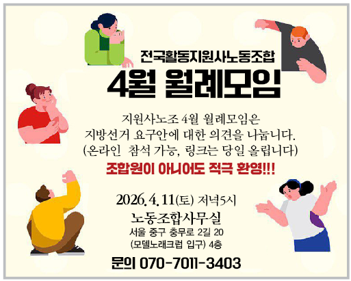 지원사노조 4월 월례모임은 지방선거 요구안에 대한 의견을 나누는 시간입니다.