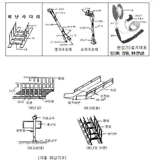 1) 피난사다리 : 고정식사다리, 내림식사다리, 올림식사다리(미끄럼 방지용 안전장치가 설치)