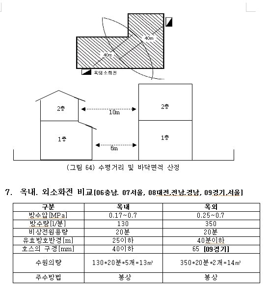 배관은 옥내소화전설비에 준하여 설치하되 구경을 65㎜이상으로 하며 호스접결구(방수구)는 소방대상물의 각 부분으로부터 수평거리 40m이내가 되도록 설치하고, 옥외소화전설비는 1층과 2층에 한하여 당해설비의 유효 범위에 포함된다.