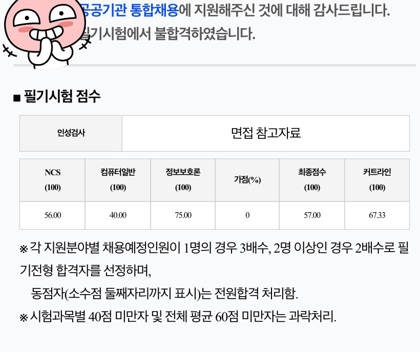 안녕하세요. 약 한달반 전에 급하게 공공기관 전공과목을 준비한다며 글을 남겼던 수험생입니다. 오늘 필기 결과가 발표가 났는데 불합격했지만 머리도 식히고 환기할 겸 글 남깁니다.
