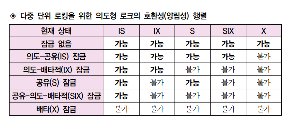 다중 단위 로킹을 위한 의도형 로크의 호환성(양립성) 행렬 관련 질문입니다. 작성자hihihihihihi|작성시간21.08.29|조회수928 목록 댓글 1 글자크기 작게가 글자크기 크게가 호환성 행렬이라는 의미가 T1이 노드N에 대해 특정 로킹을 한 상태(표의 현재상태 열)일때 T2가 걸 수 있는 로킹을 의미하는 것일까요? 다음검색 현재 게시글 추가 기능 열기 북마크 공유하기 신고 센터로 신고 댓글 댓글 1 댓글쓰기 답글쓰기 댓글 리스트 작성자모모나 | 작성시간 21.08.29 행으로 보든 열로보든 똑같은 결과입니다. 댓글 전체보기