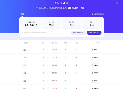 정오답을 즉시 채점해주고 응시 결과와 회차별 성적을 한눈에 비교할 수 있습니다.