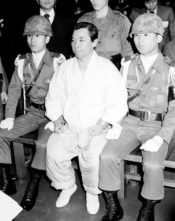노상원 피고인은 사복차림이고 또한 그에게 수갑 등 보호장비(과거에는 '계구')를 착용시키지 않았습니다. 그것이 원칙이기 때문이죠. 아래 김재규 전 중정부장 관련 이미지에서 보듯이 과거의 형사재판은 조금 살벌했다고 봐야죠.