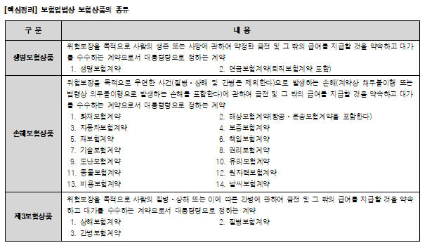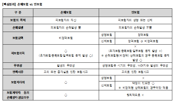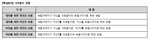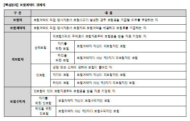 보험의 경우 일단 용어가 조금 헷갈립니다. 손해보험과 인보험... 용어 자체가 조금 이상하다는 느낌이 들죠. '손해보험'이 아니라 '재산보험'이라고 해야 더 어울리거든요. 피보험자와 보험수익자... 더 헷갈리죠. 보험에서는 사용되는 '용어'의 의미를 잘 파악하고 있어야 해요. 100% 완벽하다고는 할 수 없지만(수학이 아닌 법학에서는 '100%' 이런 개념은 존재하지 않습니다), 아래 그 용어 등의 개념을 도표로 정리해 보았습니다. 공부에 도움이 되실 거에요.