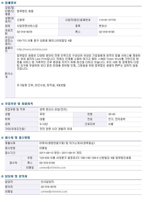 이용미 변리사님(ymlee@shinkim.com)한테 바로 이력서 보내주셔도 됩니다 ^^