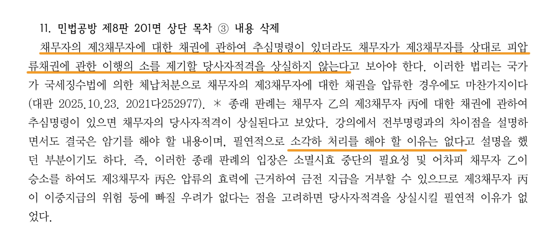 민사소송법에서 피압류채권자의 당사자적격이 상실되지 않는 것으로 바뀐 전원합의체 판례가 나와서, 작년 최신판례 자료를 다시 보다가 궁금한 부분이 생겼습니다