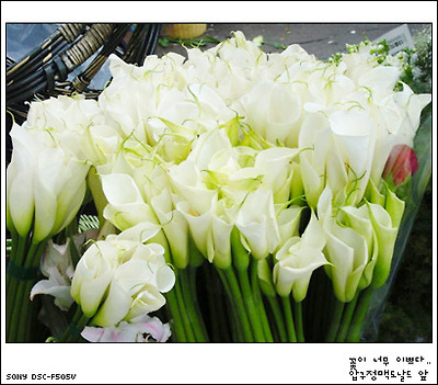 ♥ 나의 꽃 카라 난 개인적으로 카라꽃을 젤로 좋아한다. 항상 청순하면서 깨끗하고 수줍으면서, 당당한꽃 카라...항상 자신을 지켜내고 있는듯한 숭고함. 처음 카라를 접하게 된건..일반인들이 카라 라는 꽃이 있는것 조차 모를 때 였다..그게 벌써 13년전이다..대중들에게 카라가 알려진건 아마 영화 '카라' 때문일 것이다. 나만 알고 있다고 생각한 카라가 많은사람에게 알려지자 난 처음에 무지 서운했다..그냥 나만알고 있는 카라로 남아주길 바라는 욕심 때문 이었을 것이다..한장의 꽃잎이 수술을 감싸고 있는 그 모습이 얼마나 매력적인가.. 카라..나의꽃 카라..날 사랑하는 모든이들이 이 꽃을 보며 날 생각한다면,, 정말 행복한 일이 아닐까?..카라꽃을 닮고 싶다..언제 까지나..쭉 뻗은 줄기 처럼 한결 같이...