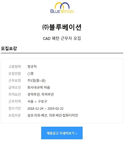 [블루베이션] : CAD 패턴 근무자 모집 (~02/22) 작성자흰소나무|작성시간19.01.08|조회수609 목록 댓글 0 글자크기 작게가 글자크기 크게가 자세한 정보 및 지원하기>>> http://joburl.kr/vUy6K 다음검색 현재 게시글 추가 기능 열기 북마크 공유하기 신고 센터로 신고 댓글 댓글 0 댓글쓰기 답글쓰기 댓글 리스트