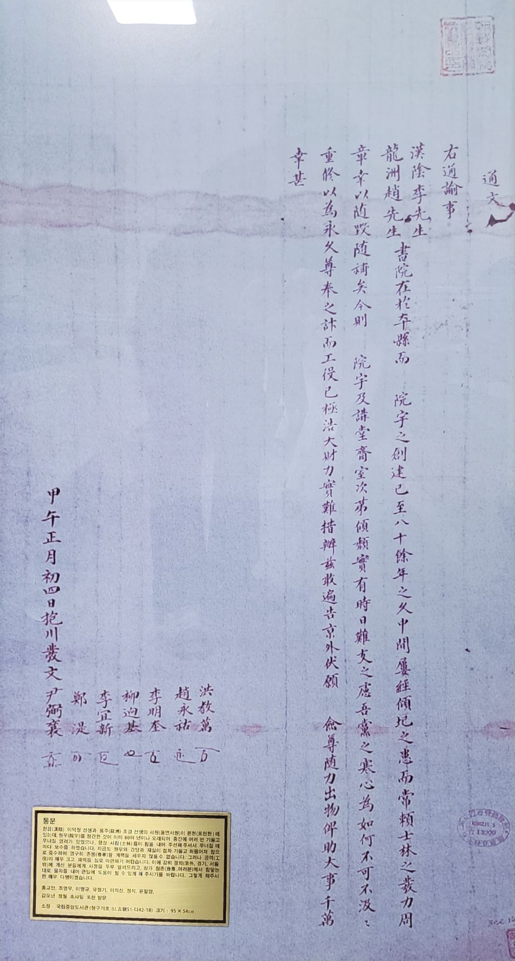 통문에는 “경외의 뜻있는 이들에게 사정을 널리 알리니, 힘이 닿는 대로 재물을 보태어 서원 보존에 힘써 달라”는 간곡한 요청이 담겨 있다. 이는 단순한 건물 보수가 아닌, 학문과 도덕의 전통을 지키려는 공동체적 의지의 표현으로 해석된다.