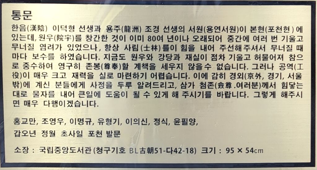 최근 확인된 통문에 따르면, 용연서원은 이미 “창건된 지 800여 년에 가까운 세월이 흐르며 여러 차례 기울고 무너질 우려가 있었다”고 기록되어 있다. 이에 따라 지역 선비들이 힘을 모아 보수를 이어왔으나, 당시에도 원우와 강당, 재실이 점차 훼손되고 있어 대대적인 중수가 필요한 상황이었다.