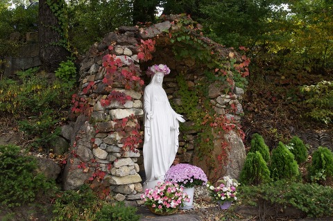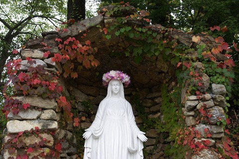 성지에서 입구에서 반갑게 맞아주시는 성모님 담쟁이 덩굴이 빨간게 물들었습니다.