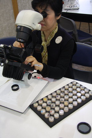 | GIK보석·디자인 직업전문학교 김정숙 학교장이 현미경을 이용해 원석을 감정하고 있다. |