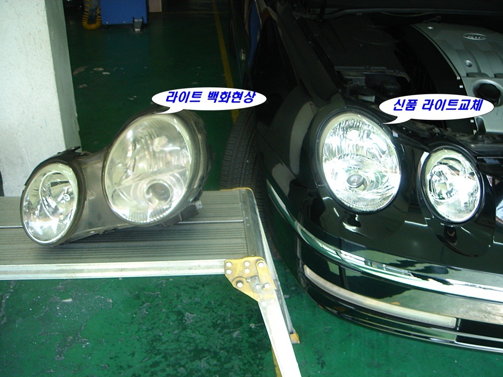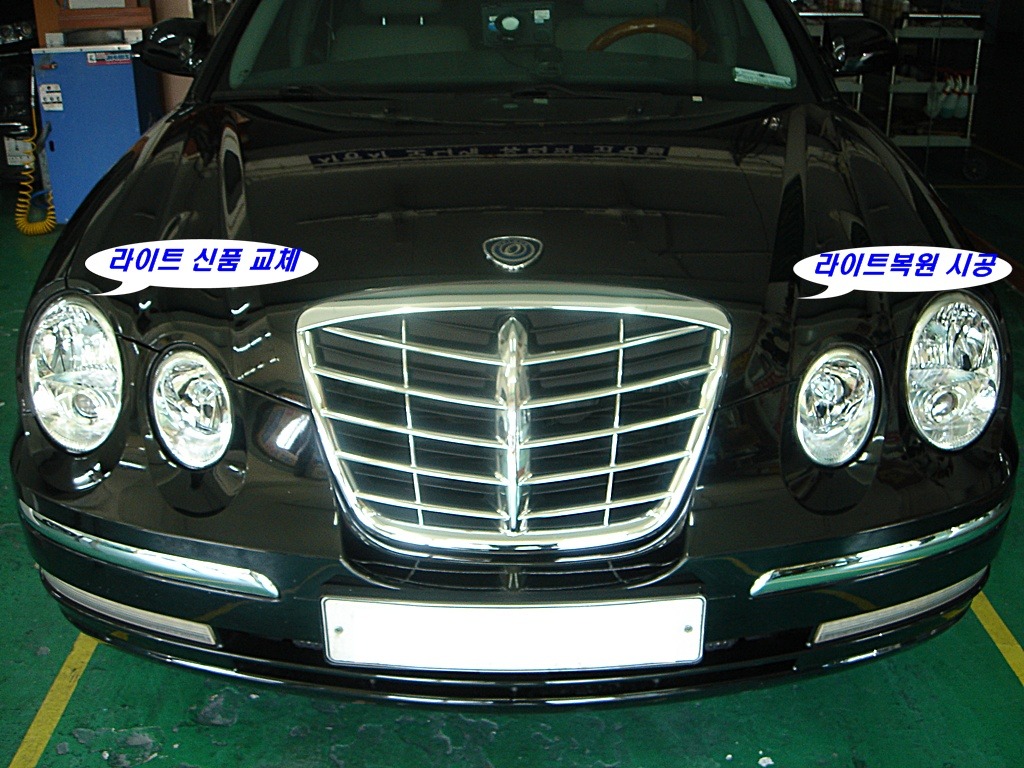 ( 오피러스 사고로 인하여 한쪽 라이트 신품교체후 다른 한쪽에 백화현상으로 비교되어 저의샵을 방문하여 HID 램프로 인하여 크롬부분, 볼록렌져, 내부카바에도 뿌옇게 변해 라이트복원을 완벽하게 신품처럼 복원하여 시공전과 시공후 모습이며 앞범퍼를 분해해야 라이트가 탈거되므로 헤드라이트를 완전히 분해하여 외부와 내부를 완벽하게 신품처럼 복원한 모습 입니다.)