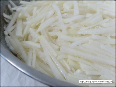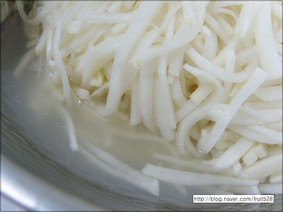 눈대중으로 봐도 작아보이는 무우 2개 채썰어 준비했어요~