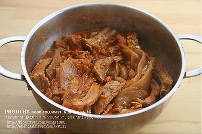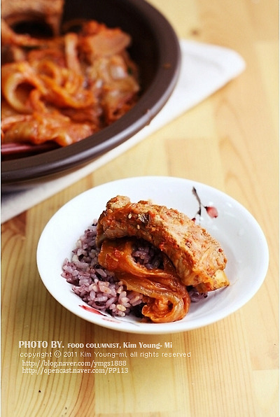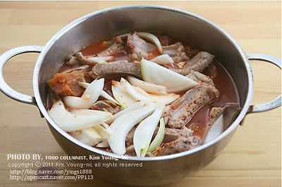 냄비에 한번 데친 등갈비와, 양파, 묵은지, 양념장과 물(3컵), 청주(1컵)을 부어주고,