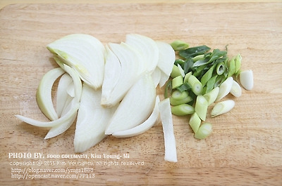 양파(1/2개)는 채썰고, 대파(1/2뿌리)는 어슷 썰고,
