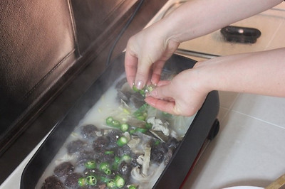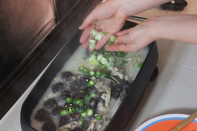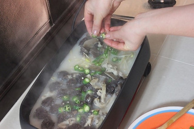 * 한소큼 끓여준후에 대파와 고추를 넣어 약한불에 살며시 끓여주다가 깻잎을