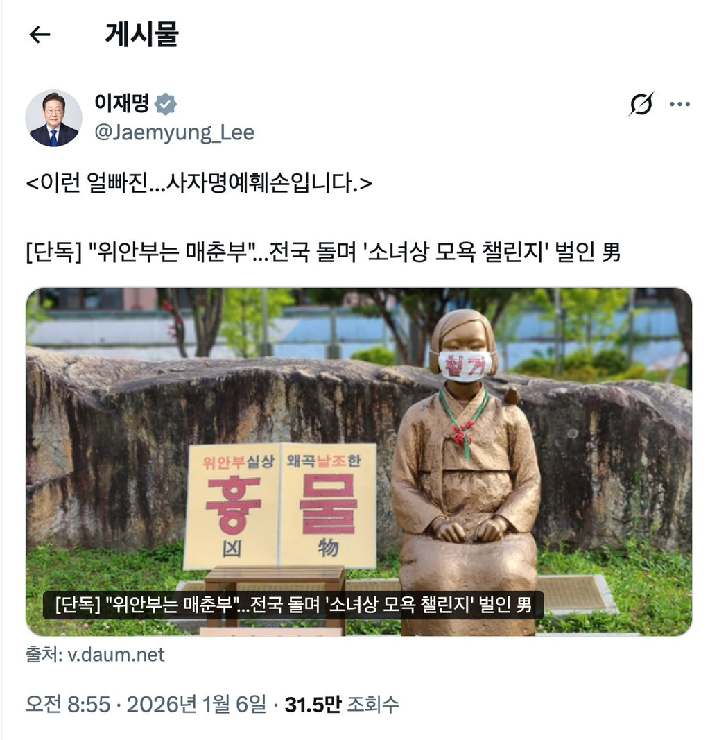 6일자 이재명 대통령 sns에 위안부퍠지국민운동본부 소녀상 모욕 훼손등 행위룰 “얼빠진 짓“이라 말하자 경찰이 이제야 수사에 착수했다고 하는데 정말 친일 뉴라이트 세력의 역사망동은 법으로 제정해서 하루빨리 뿌리를 뽑아야합니다