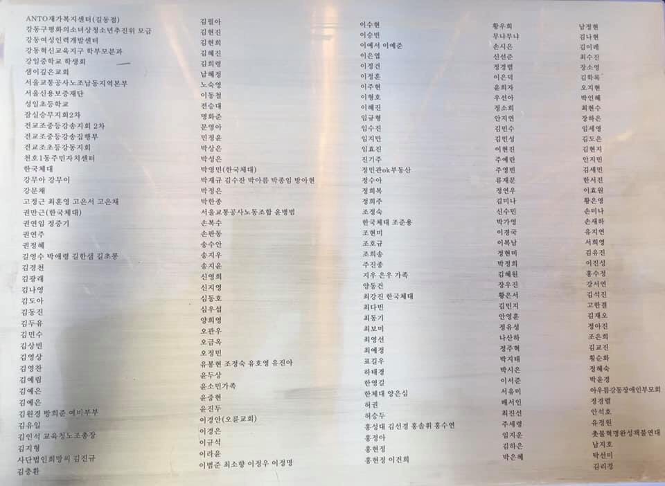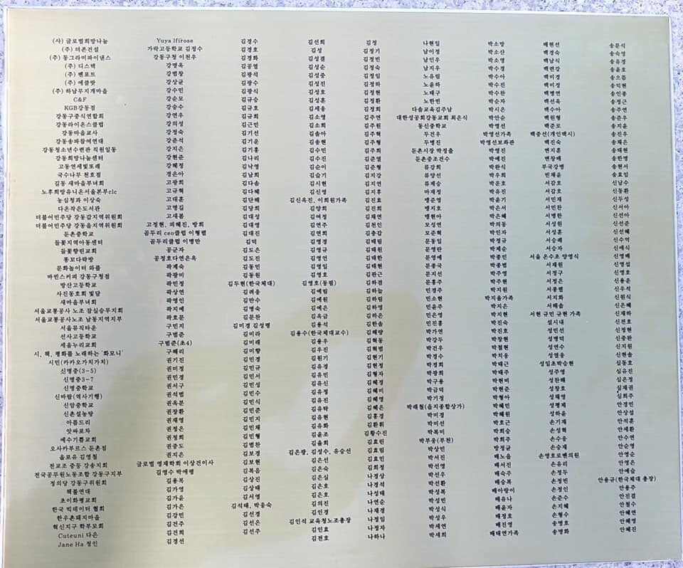 2차동판 작업 완료 작성자최형숙 로자|작성시간19.11.17|조회수87 목록 댓글 0 글자크기 작게가 글자크기 크게가 강동구평화의소녀상 건립추진위는 8월 5일 이후 입금자 및 누락자분들을 정리하여 추가 2차 동판을 제작하였습니다 ~모금에 참여해주신 추진위원님들을 오래오래 잊지않겠습니다 다음검색 현재 게시글 추가 기능 열기 북마크 공유하기 신고 센터로 신고 댓글 댓글 0 댓글쓰기 답글쓰기 댓글 리스트