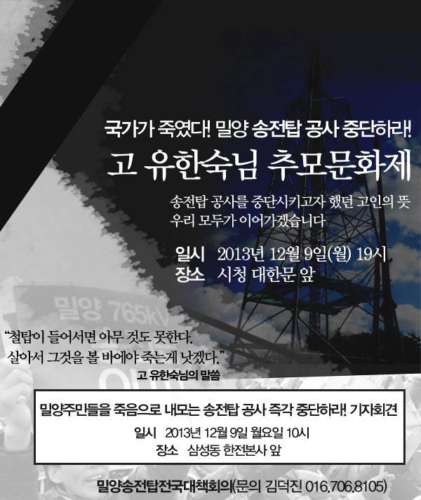 '이북에 사는 것보다 밀양에 사는 것이 더 고통스럽다는 어르신들.... 멀리서 지켜보는 것도 힘든데 현지에 계신 분들은 얼마나 힘이 드실까.' (이길*: 오마이 뉴스, 12월 7일, "억울하다, 이북 사는 주민보다 더 고통스럽다": 밀양 송전탑 반대하다 자살한 유한숙 할아버지, 장례 연기