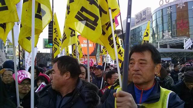 둘렀던 목도리로 얼굴을 칭칭 감싸고...누군가는 댓글 다는 컴퓨터 자판도 갖고 나오고 행진...물대포에 대비하여 비옷도 준비하고...밀양에서 돌아가신 어르신